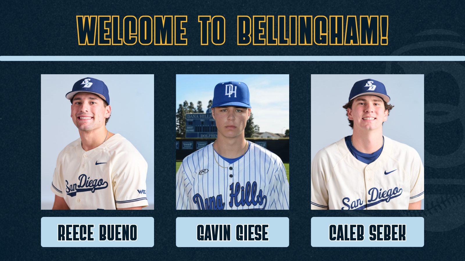 BELLINGHAM, WA — Friday, February 27, the Bellingham Bells announced the additions of three new players for the 2026 season. Reece Bueno, Gavin Giese and Caleb Sebek head North on I-5 from the University of San Diego to Joe Martin Field this summer.